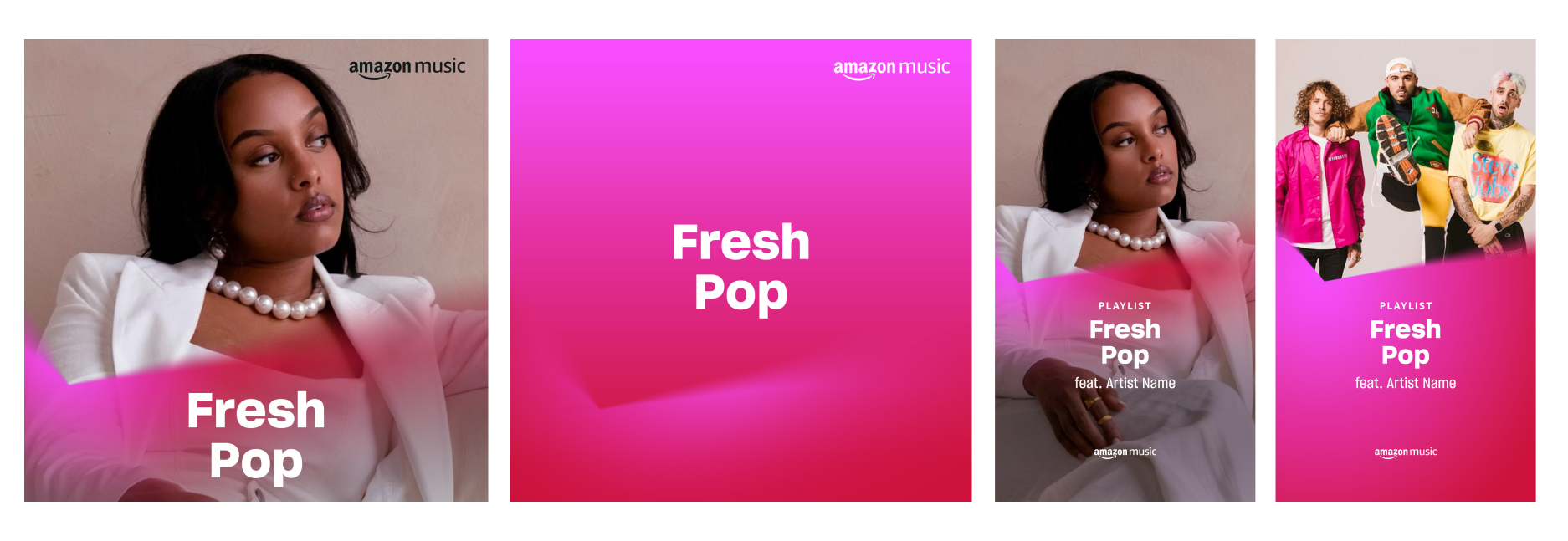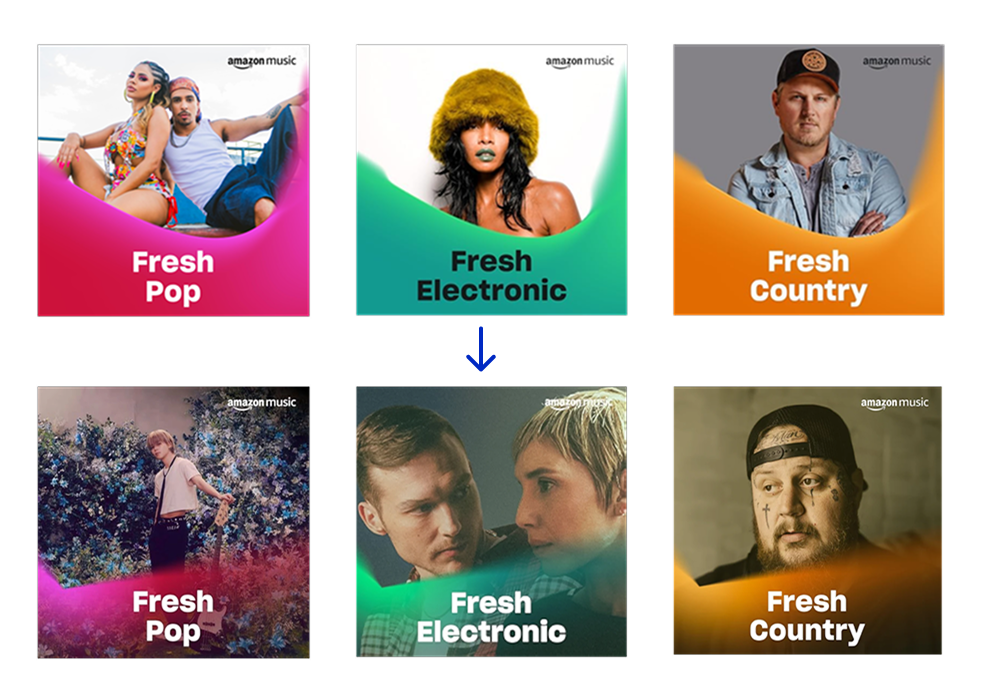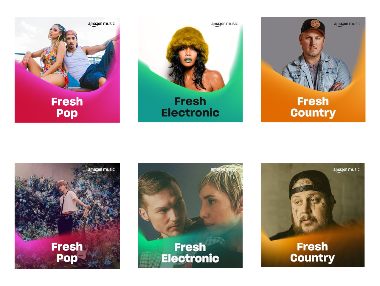 The previous playlist visuals lacked consistency, which limited their impact across Amazon Music’s platform and marketing touchpoints. The challenge was to create cohesive designs for four unique series while honoring Amazon’s gradient-heavy, blur-forward brand guidelines. Each series had to feel part of the same family while maintaining its own personality, with the Fresh series standing out as the boldest due to its large and growing audience.