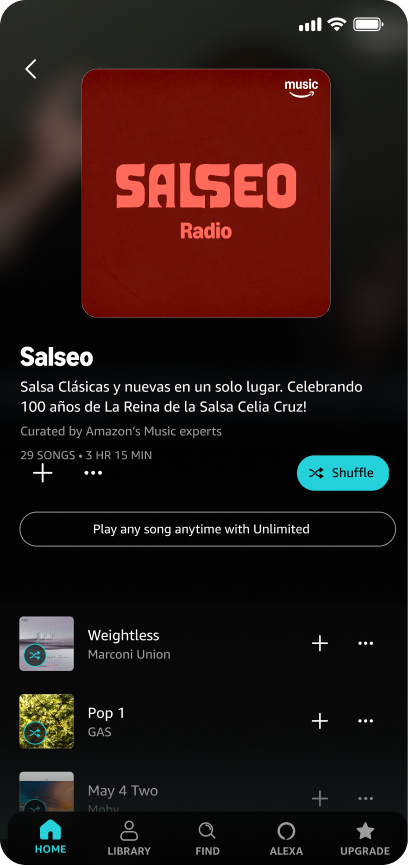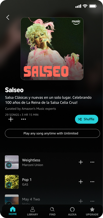 The final identity delivered a bold, dynamic word mark and a suite of adaptable templates that celebrated both the roots and future of salsa. The launch coincided with Amazon Music’s “100 Years of Celia Cruz” campaign, with the Salseo branding featured prominently on out-of-home screens in Miami and New York — giving the playlist strong cultural visibility and reinforcing Amazon’s commitment to Latin music heritage.